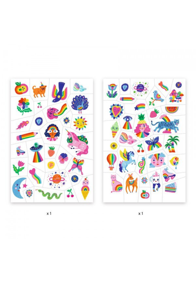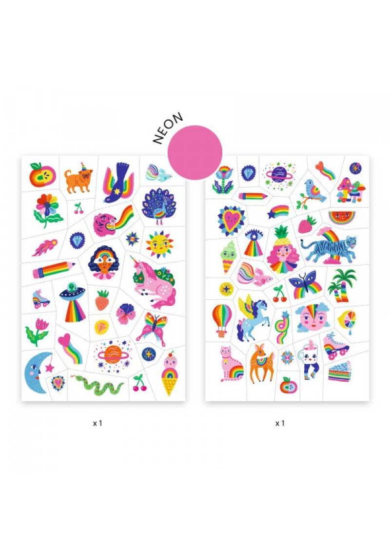 Krāsaini tetovējumi bērniem ar spīdumiem. Lielisks veids, kā izrotāties ikdienā vai svētkos! Ērti lietojami un viegli nomazgājami. Dermatoloģiski testēti un droši bērniem. Komplektā ietilpst 2 lapas (14 x 21 cm) ar 69 dažāda izmēra un formas tetovējumiem. Starp tetovējumiem ir punktota līnija, kas atvieglo tetovējumu atdalīšanu no pamatnes. Sevišķi ērta lietošana dažādos pasākumos un ballītēs. Kā lietot tetovējumu? 1. Atdaliet no pamatnes tetovējumu, ko vēlaties izmantot. 2. Uzmanīgi noņemiet caurspīdīgo aizsargplēvīti, kas to pārklāj. 3. Novietojiet tetovējumu uz ādas un samitriniet tā otru pusi. 4. Turiet to, piespiestu pie ādas, aptuveni 30 sekundes un tad noņemiet papīrīti! Uz ādas būs skaists un noturīgs pagaidu tetovējums! Brīdinājums! Nav piemērots bērniem, kas jaunāki par 3 gadiem, satur sīkas detaļas, pastāv aizrīšanās risks. Lai noņemtu tetovējumu, izmantojiet ziepjūdeni vai maigu kosmētikas noņemšanas līdzekli. Nelietot uz jutīgas ādas vai ievainojumiem. Nelietojiet uz sejas. Nelietojiet, ja ir alerģija pret līmēm. Nav ēdams – nenorīt! Vispirms pārbaudiet uz neliela ādas laukuma. Neturpiniet, ja āda kļūst kairināta. Ja tetovējums ilgstoši atradies uz pamatnes ar noplēstu aizsargplēvīti, tetovējums var izžūt un tā uzlīmēšana uz ādas var neizdoties. Ražotājs: Djeco Vecums: no 3 gadiem Izmērs 230x145x1 Materiāls: Paper / Carton Art.DJ09617