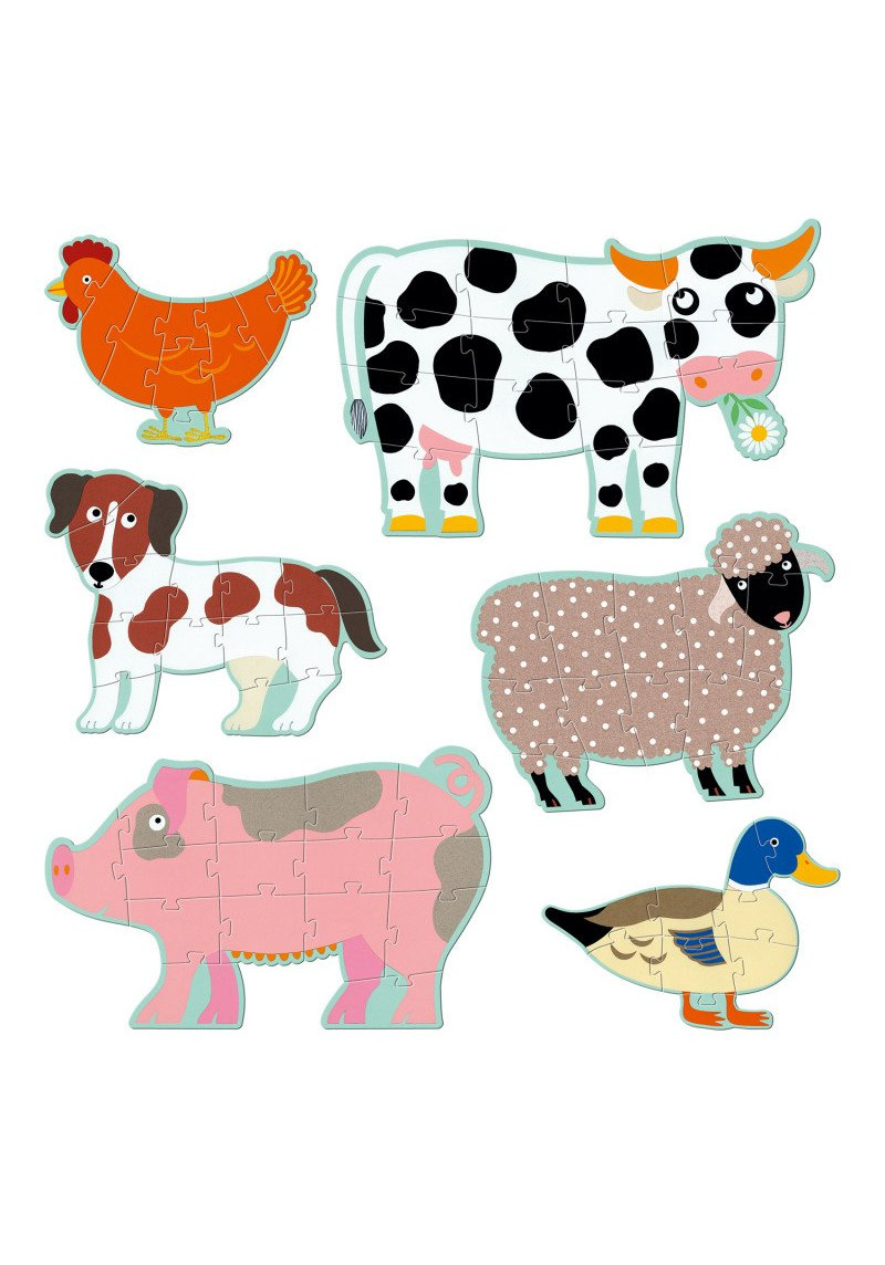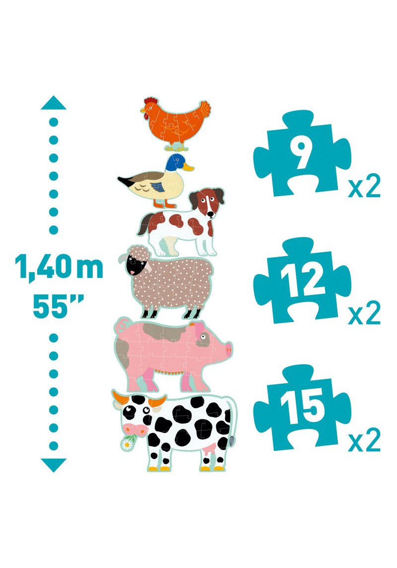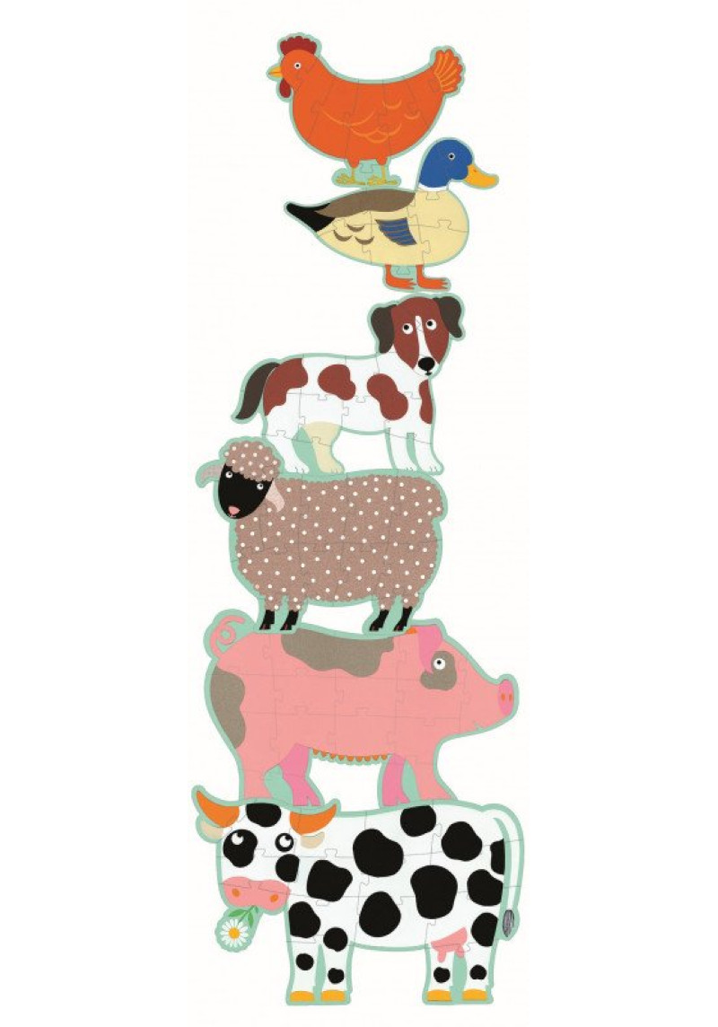 Seši jautri dzīvnieciņi, kas kopā veido 1.4 metrus augstu puzli. Saliec katru no zvēriņiem, apgūstot puzles salikšanu no aizvien vairāk gabaliņiem un iepazīstot, kādi dzīvnieciņi sastopami fermā. Tā kā puzles gabaliņi ir ļoti lieli, visērtāk būs to salikt uz grīdas! Komplektā ietilpst 2 puzles ar 9 gabaliņiem (vistiņa un pīle), 2 puzles ar 12 gabaliņiem (aitiņa un suns) un 2 puzles ar 15 gabaliņiem (cūka un gotiņa). Puzle veidota no bieza, izturīga kartona, kas lielās detaļas padara viegli satveramas arī maziem bērniem.