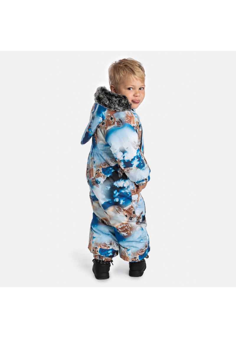 Mazuļu kombinezons KEIRA, tumši zils ar rakstu 300gr Bērnu ūdensnecaurlaidīgs un vēja necaurlaidīgs kombinezons. Elpojošs audums. Piemērots gan zīdaiņiem, gan mazuļiem, kuri jau prot staigāt. Iekšpusē jauka un mīksta flaneļa odere. Integrēta elastīga lente piedurkņu un kāju galos. Noņemama kapuce, kas piestiprinās pie apkakles ar spiedpogām, lai nodrošinātu drošību, ja valkātājs iesprūst. Piedurkņu un kāju galus var ērti nolocīt 68.–80. izmēros. Ūdensnecaurlaidīgas līmētas vīles. Kombinezonam nav iekšējo kāju vīļu. Elastīgas pēdu siksnas. Noņemama mākslīgās kažokādas apdare uz kapuces. Atstarojošie elementi uz auduma nodrošina drošību valkājot tumsā. Art.31920030-53186